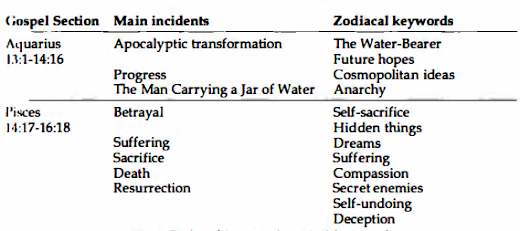 不過,任何熟悉黃道十二宮象徵主義的人都會立刻認出,手拿水瓶的人毫無疑問就是水瓶座的形象。但為什麼故事要直到這時才讓他出場呢?為什麼這些水瓶座的形象會伴隨著社會動盪的預言、“駕雲降臨”(13:26)的宣告一起出現呢?更有趣的是,為什麼當這部福音接近尾聲時,繼水瓶座之後又出現了雙魚座的形象——背叛、受苦、犧牲?如果這兩個星座,亦即黃道十二宮的最後兩個星座的存在是如此明顯,那麼其它星座會不會也有出現呢?答案是確實有。不過它們未必是以最明顯的星座形象(雖然至少有一個),而是以與該星座有關的神話和心理學意象與主題來呈現。事實上,這部福音可以直接按照黃道十二宮被劃分成十二個部分。這一點僅僅適用於《馬可福音》。雖說另外兩部對觀福音書(《馬太福音》和《路加福音》)與《馬可福音》有很多內容上的重疊,但它們的故事順序並不相同。《約翰福音》的情況也類似:黃道十二宮並沒有出現在裡面。