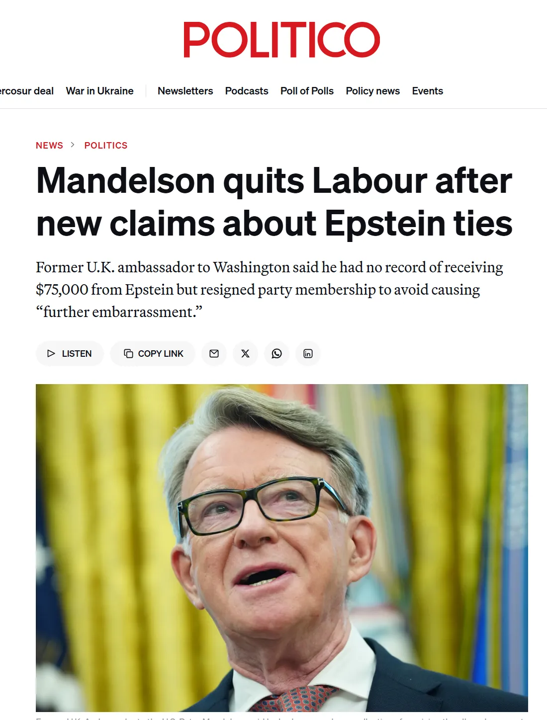 就在愛潑斯坦的摩根大通帳戶紀錄被公開後,曼德爾森已於2026年2月1日辭去了他在工黨的職務。解密的文件顯示匯入帳戶中的三筆金額均為兩萬五千美元的款項疑似是來自曼德爾森,同時還有證據表明愛潑斯坦曾在2009年向曼德爾森的同性丈夫匯款數千英鎊以作為教育支出。儘管曼德爾森表示他對這些款項毫無印象,並質疑其真實性,但文件裡還包含了一張他只穿著內褲站在一名臉部被遮擋的女子身旁的照片。曼德爾森聲稱他不記得照片是在什麼時候拍攝的。這張照片是在他因為與這位金融家的關係被公開,而被免去大使職務的幾個月後曝光的。